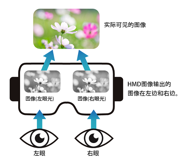 当人目视现实世界时,左右眼会映入略微不同的世界。我们通过映入左右眼的细微"位置偏差"来感知与物体的距离以及物体各自的大小。HMD(头戴式显示器)也使用这种机制,通过向左眼和右眼显示略微不同的影像来重建三维空间。