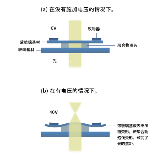 该镜头是一种超快速自动对焦镜头,由光学聚合物制成的镜头核心和压电致动器组成。通过向致动器施加电压使镜头核心变形并控制镜头的焦距。传统镜头使用VCM(音圈马达)进行自动对焦,由于图像传感器与镜头之间的位置关系发生变化,必须高速和高精度地移动单元来快速重新调整对焦,因此不擅长清晰和准确地捕捉图像。聚合物镜头只需改变光学聚合物的厚度,即可对位于不同动作距离的物体和有高低差的物体快速对焦,因此能够克服这些限制。实际上自动对焦只需要很短的1毫秒,这是VCM的约10倍的速度。